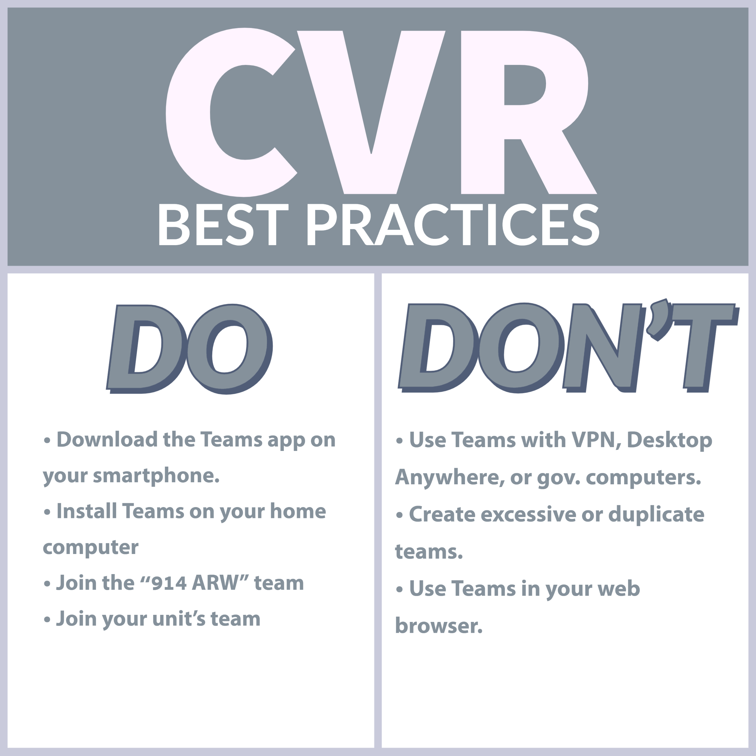 DoD CVR for Microsoft Teams Im a DoD employee and was told in order to login into Microsoft Teams I need a CVR designator. A feature comparison table would be helpful if there is a link.